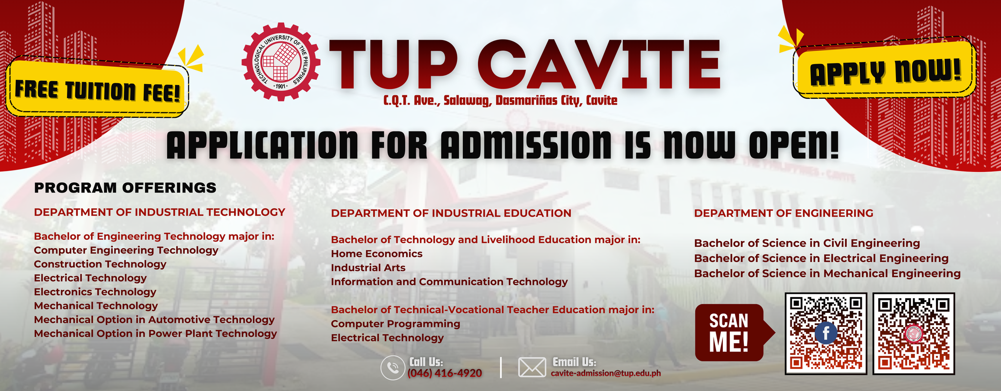 Technological University of the Philippines – Cavite Campus was established in 1979 as one of the three prototype technician institutes in the Philippines. It is a satellite campus located at Salawag, Damariñas, Cavite. At present, TUP Cavite offers programs in pre-baccalaureate and baccalaureate level.